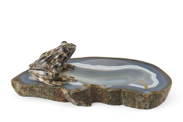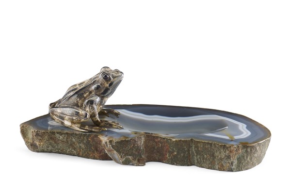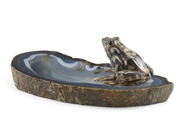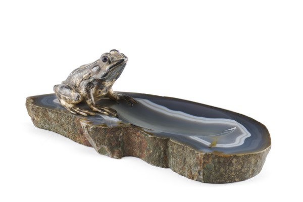 BUCCELLATI - MARIO MINOTTO. A hard stone shaped pocket emptier surmounted by a silver frog with amethyst cabochon eyes (cm 22,5x11) (slight defects)