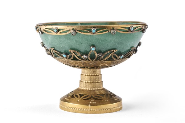 Piccola coppa in avventurina con ghiera e base in oro traforato con applicazion