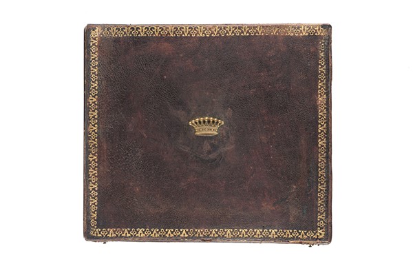 C. Saignac (Francia, secolo XVIII-XIX) "Ritratto di letterata" miniatura ovale su avorio (cm 16x14) firmata e datata 1784 a sinistra. In custodia in pelle impressa in oro decorata da corona in rilievo
