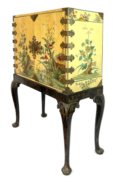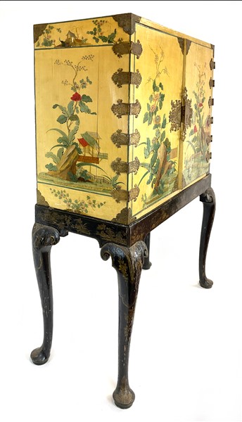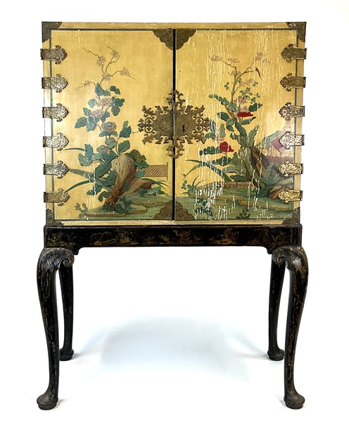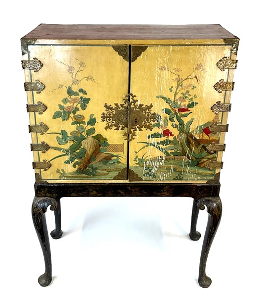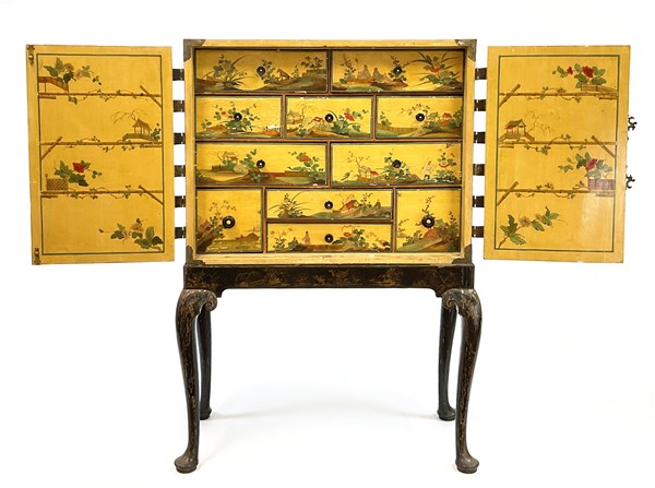 Monetiere in legno dipinto e laccato con decori policromi a paesaggi orientali animati, parte superiore a due ante con cerniere e bocchetta in metallo sagomato e dorato, interno con undici diversi cassetti, sostegno con gambe mosse in legno ebanizzato e decorato a cineseria in oro. Secolo XIX (cm 114x163x53) (difetti e restauri)