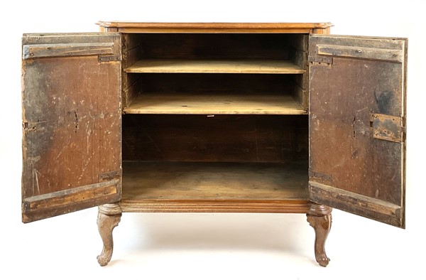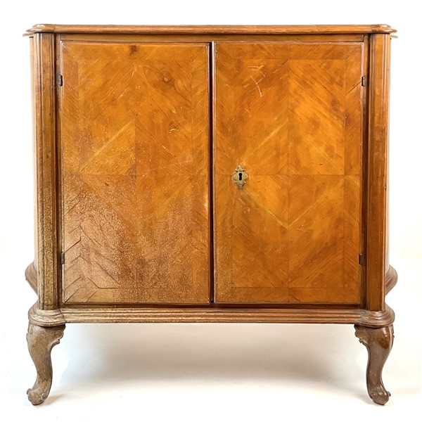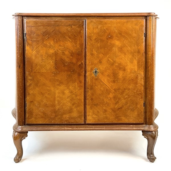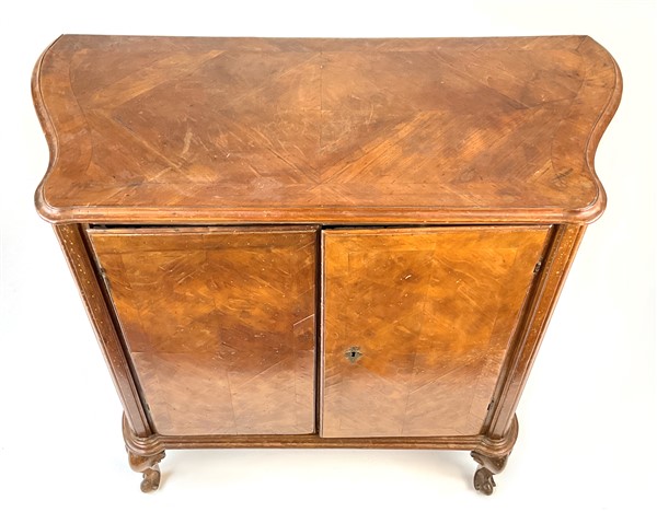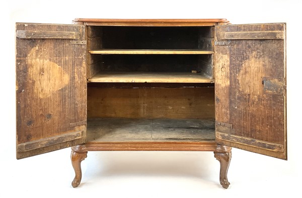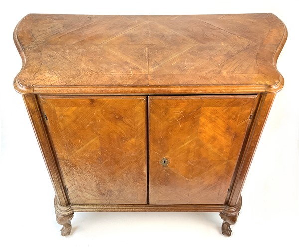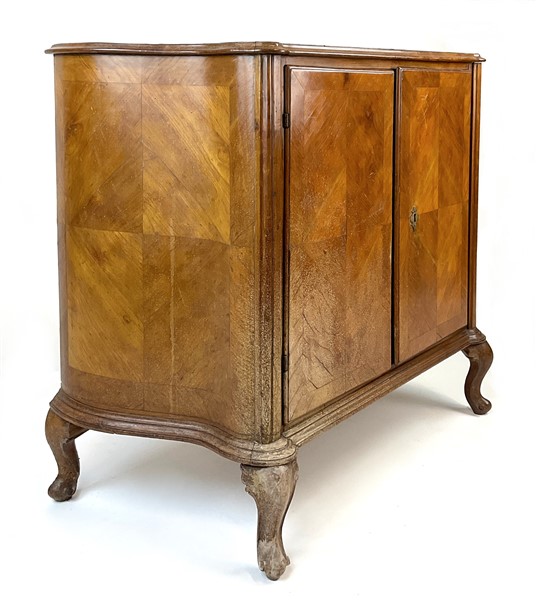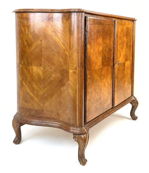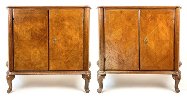 Coppia di credenze di forma mossa lastronate in noce, fronte a due ante e piedi mossi terminanti a ricciolo. Veneto, secolo XVIII (cm 105x92x49) (difetti e restauri)
