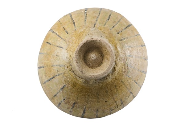 Manifattura persiana, secolo XII-XIII. Coppa in terracotta dipinta in policromia con rosone vegetale nel cavetto e falda decorata da raggiera a motivi alternati (h. cm 9,5; d. cm 19,5) (ricomposta con integrazioni)