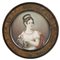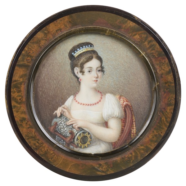 Arte di inizio secolo XIX. Coperchio di tabacchiera in tartaruga decorato con miniatura in avorio raffigurante dama con diadema e collana di corallo (d. cm 5) (difetti)