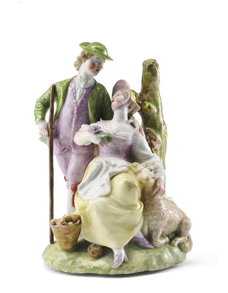 Manifattura di Cozzi (?) Venezia, secolo XIX. Gruppo in porcellana policroma raffigurante scena galante con pecorella e cesto di frutta (h. cm 16) (difetti)