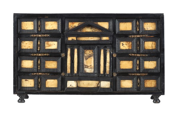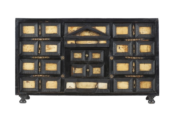 Monetiere in legno ebanizzato con fronte ad otto cassetti e anta centrale di impianto architettonico, decorato da inserti in pergamena entro cornici a rilievo guilloché. Secolo XVII (cm 80x47x26) (difetti e rotture)