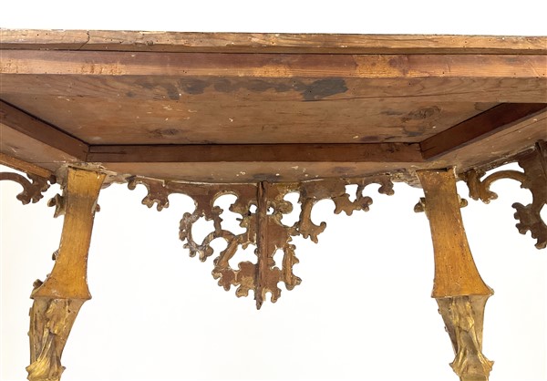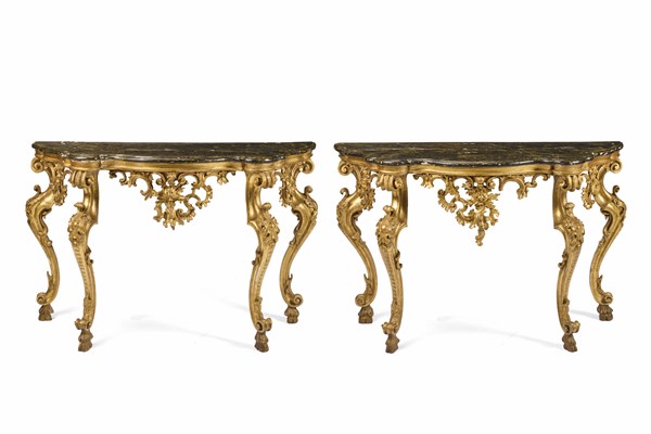 Coppia di console in legno intagliato e dorato, grembiali traforati a volute e piano sagomato dipinto a finto marmo, gambe mosse terminanti a ricciolo, piedi a zoccolo caprino. Secolo XVIII (cm 139x88x49) (difetti, restauri e mancanze)