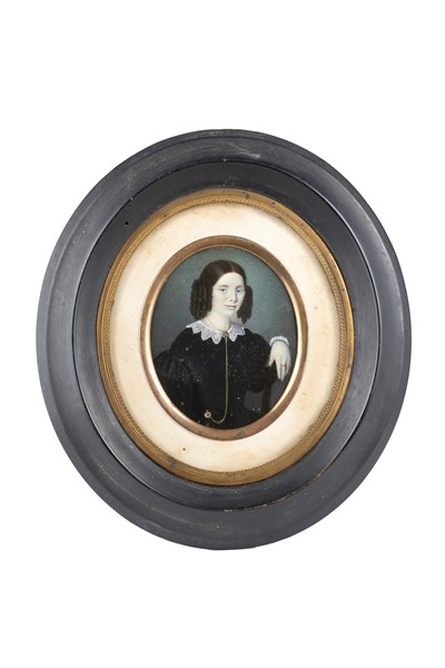 Maestro della prima metà del secolo XIX "Ritratto di dama con collo in pizzo" miniatura ovale su avorio (cm 7,5x6) In cornice ebanizzata. Iscritto al retro in maniera indistinta (difetti)
