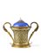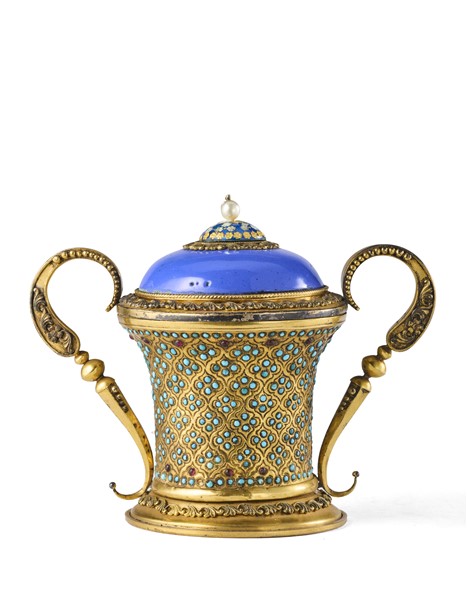 Coppa biansata con coperchio in vermeille e smalti, corpo decorato da applicazi