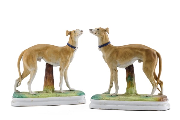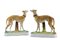 Manifattura francese (?) secolo XIX-XX. Coppia di levrieri in biscuit dipinto i
