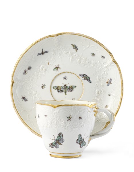 Manifattura di Nymphenburg, secolo XVIII. Tazzina con piattino in porcellana bianca a ghirlande di fiori a rilievo, farfalle policrome, profili dorati, manico a doppia ansa intrecciata (tazzina h. cm 7; piatto d. cm 14,5) (difetti)