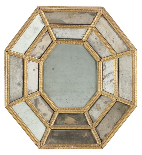 Specchiera ottagonale a doppio ordine con profili in legno intagliato guillochè