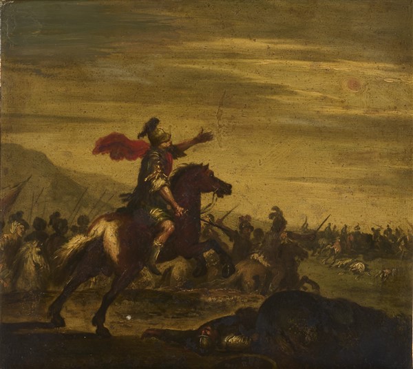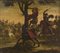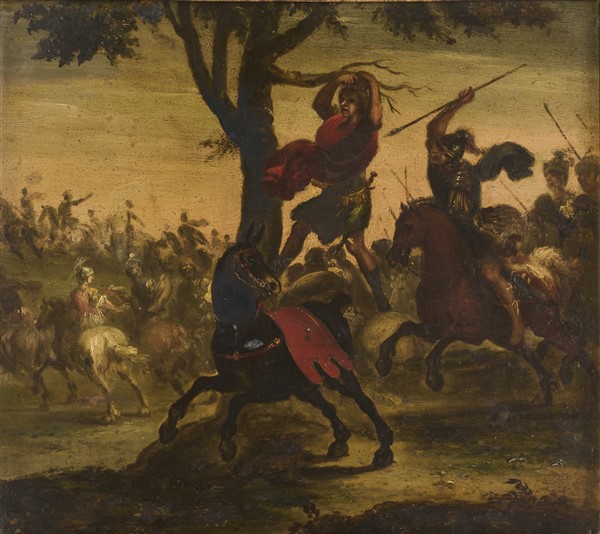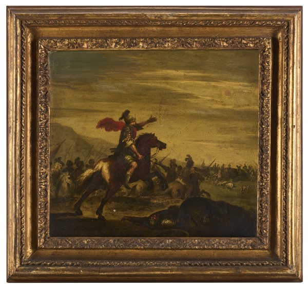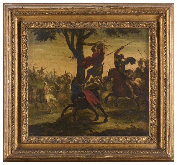 Maestro del secolo XVII Coppia di dipinti raffiguranti "Scene di battaglia" ol