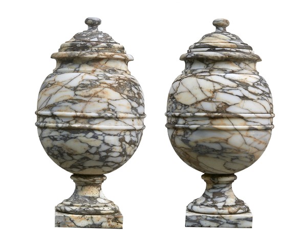 Coppia di vasi ovoidali con coperchio in breccia su base quadrata (h. cm 53) (d