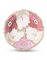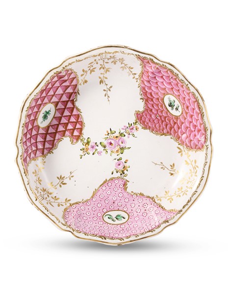 Manifattura di Pasquale Rubati, Milano, 1770-1790. Piccolo piatto a bordo leggermente rilevato e cavetto piano in maiolica policroma, decorazione a settori 'alla porcellana' in diverse gradazioni di rosa con motivi a triangoli, ad occhio di pernice, a griglia e a tegole con al centro mazzo di piccoli fiori. Al profilo del bordo e delle riserve corre un motivo a festone in oro. Sul retro, pennellata in bruno (d. cm 20,5) (lievi sbeccature)