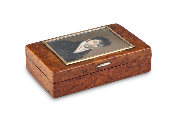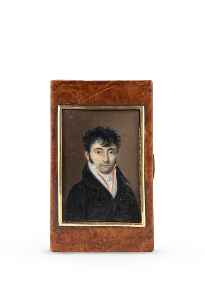Arte del secolo XIX. Tabacchiera in radica con interno in oro e tartaruga, coperchio decorato da miniatura in avorio raffigurante gentiluomo in abito blu firmata e datata Battalio 1843 (cm 9x5,5) (difetti)