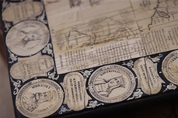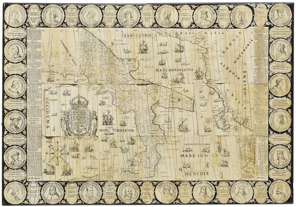Arte del secolo XVI-XVII. Piano in legno ebanizzato lastronato in avorio pirografato raffigurante la mappa del Regno di Napoli con stemma di Filippo II entro cornice con medaglioni che ritraggono numerosi regnanti medievali tra cui Federico II di Svevia intervallati da cartigli iscritti (cm 54,5x79) (difetti, restauri e mancanze)