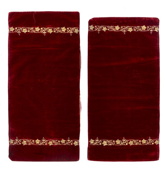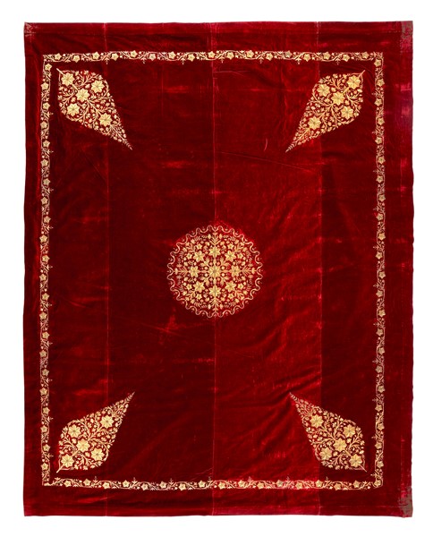 Manifattura dell'Impero ottomano, secolo XVIII-XIX. Copriletto matrimoniale con due copricuscino in velluto di seta decorati con fili di argento dorato. tessuti a mano totalmente in seta: la base con trame e ordito in seta reca i fili di ordito aggiunti color cremisi a formare il velluto. Il copriletto presenta un medaglione centrale circolare e quattro angolari sempre decorati a formare palmetta con cornice a meandro realizzati in filo d'argento dorato. I due copri cuscino di dimensioni leggermente differenti sono ugualmente in velluto di seta color cremisi e sono decorati all'esterno sul lato più corto con decori a meandro realizzati in fili d'argento dorato (cm 218x170; cm max 99x47) (lievi difetti)