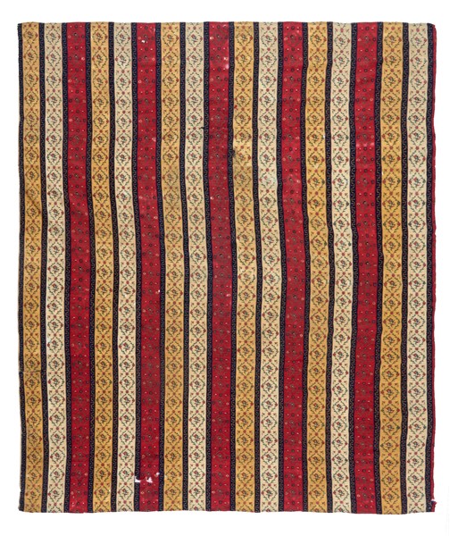 Scialle Kashmir, India, secolo XVIII-XIX. Spolinato a mano in lana. Decoro a fondo giallo a righe alternate di differenti dimensioni decorate con fiorellini stilizzati e greche. La peculiarità è l’individuazione di una E ripetuta lungo una delle fasce (cm 146x123) (difetti e piccoli strappi)