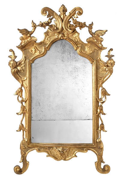 Specchiera in legno intagliato, inciso e dorato con decoro a volute fogliate, cimasa traforata sormontata da mascherone tra ghirlande di fiori sostenute da animali fantastici, ai lati pendenti di foglie e fiori con volti, piedi a ricciolo. Toscana, secolo XVIII (cm 96x156) (difetti e restauri)