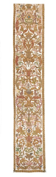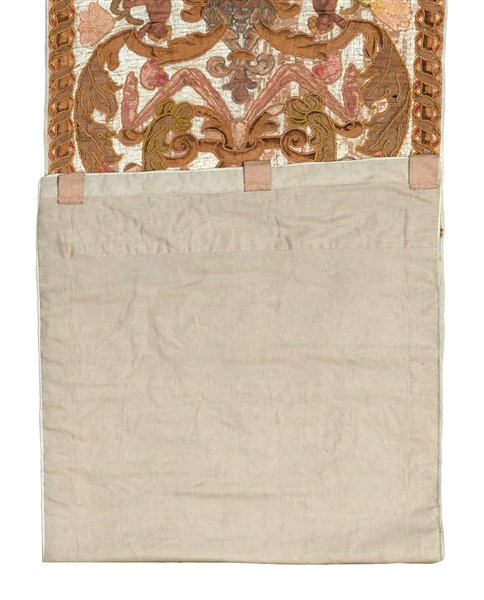 Manifattura Toscana, secolo XVI. Pannello da parati. Decoro con putti, volute, fiori fantastici, foglie d'acanto, volatili, trionfi di frutta realizzati con tessuti ritagliati e dipinti cuciti su un fondo di seta bianca scioccata legata da distanti fili di trama. Profili della decorazione evidenziati da cordoncini di seta di diverso colore, la cornice a guisa di bastone con nastri concatenati (cm 432x84) (difetti e restauri)