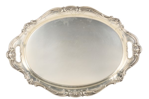 Vassoio biansato di forma ovale a profilo mistilineo in argento e inciso e sbalzato con decoro a volute fogliate. Punzoni di Birmingham. Argentiere Gorham, secolo XX (g 3700) (L. cm 65) (lievi difetti)