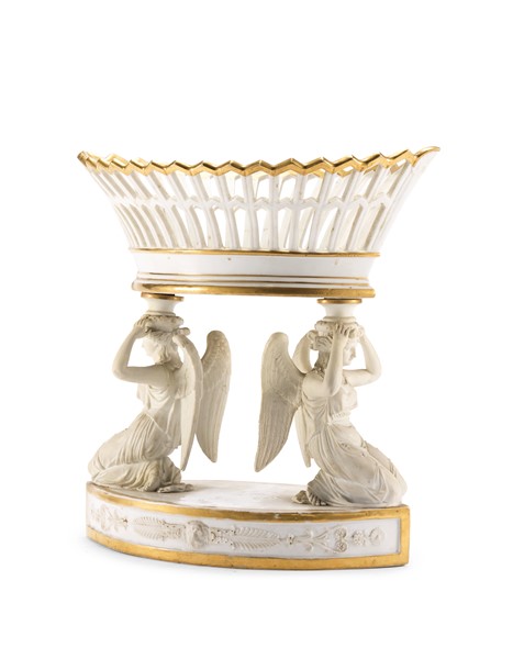 Manifattura francese, secolo XIX. Centrotavola in porcellana bianca con profili dorati, base decorata da fregi classici, montanti a figure alate a tutto tondo in biscuit che sorreggono cesto traforato. (cm 34x26x34) (difetti)