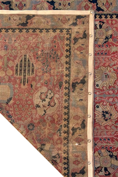 Tappeto Tabriz, Persia, secolo XX. Decoro all over di ispirazione safavide con vasi fioriti, palmette e rosette su campo color rosa antico, bordura a meandro delineata da due piccole bordure con decoro Medacyl (cm 306x190) (difetti e vecchi restauri)