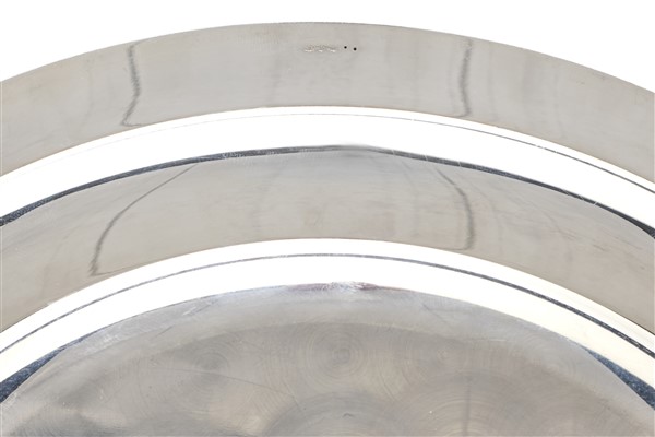 Dodici sottopiatti in argento con bordura a foglie lanceolate e profilo perlinato. Alessandria, argenteria Ricci (g 6600) (d. cm 29,5) (lievi difetti)
