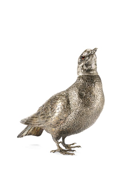 Contenitore con coperchio in foggia di colombo in argento con piumaggio cesellato e occhi in pasta vitrea (cm 23x21) (g 500) (lievi difetti)