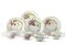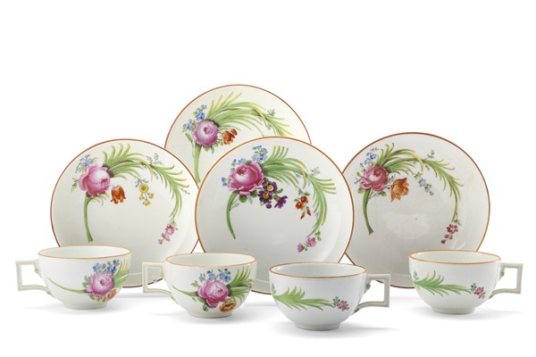 Manifattura di Meissen, secolo XIX. Gruppo di quattro tazzine da tè con piattini in porcellana policroma con mazzi di rose, fiori e ramo di palma. Marcati sotto la base (tazza h. cm 4,5; piattino d. cm 14) (difetti e restauri)