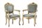 Coppia di poltrone in legno intagliato, dipinto e dorato, braccioli terminanti a ricciolo, schienale sormontato da cartella con fiore tra girali, fascia centrata da mascherone, gambe mosse terminanti a ricciolo. Secolo XIX (difetti e restauri)