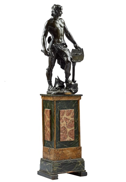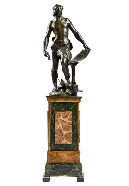 scultura in bronzo, firmata in basso (h. cm 70) su base a plinto in legno dipinto a finti marmi policromi (h. tot cm 142) (difetti)