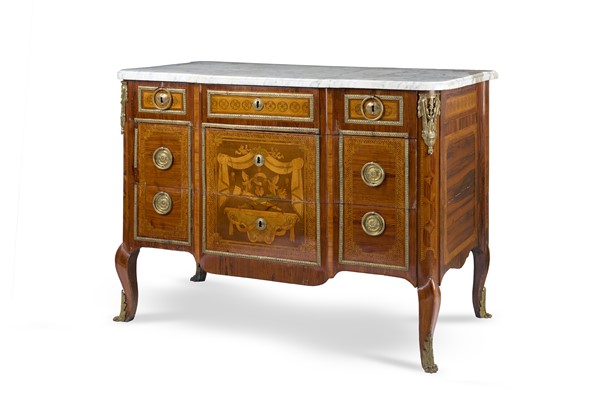 Cassettone lastronato e intarsiato in legni di varie essenze, fronte mosso a due cassetti e tre più piccoli allineati sottopiano, decorato a trofeo d'amore su mensola e festone retto da amorini entro riserva, gambe mosse con piedi ferini in bronzo, montanti con fregi in bronzo, bordure e maniglie in metallo, piano sagomato in marmo. Parigi, secolo XVIII. Stampigliatura J. FAUVEZ e JME (Jurande des Menuisiers Ebénistes) sul montante posteriore (cm 126x95x65) (difetti e restauri)