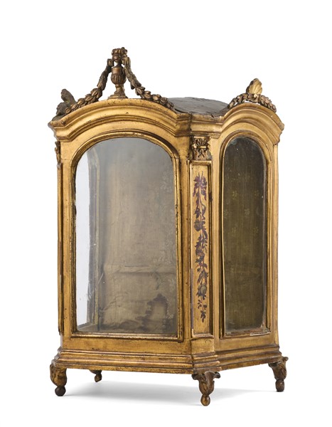 Teca in legno intagliato, dorato e dipinto con cimasa a vaso e festoni, montanti decorati a fiori, sportello laterale. Secolo XVIII (cm 36x51x25) (difetti, mancanze e restauri)
