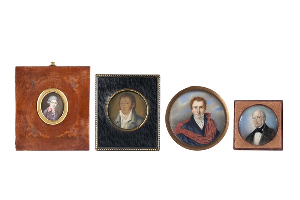 Arte del secolo XIX. Quattro miniature su avorio di diversi autori raffiguranti gentiluomini. Due con firme non identificate (d. max cm 8) In cornici (lievi difetti)