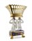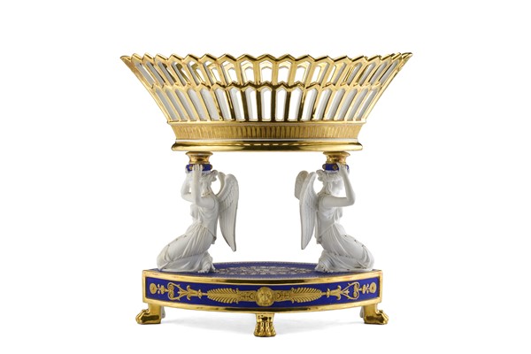 Manifattura francese, inizio secolo XIX. Alzata in porcellana con coppa traforata e sostegni a figure alate in biscuit, base ogivale su piedi ferini, decori a rilievo in oro su fondo blu (cm 37x34x29) (difetti, lievi restauri e mancanza)
