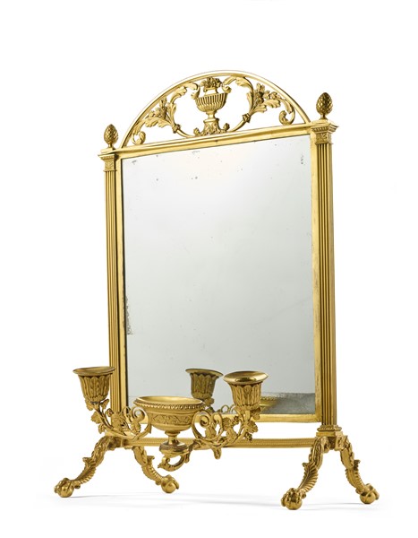 Psiche da tavola in bronzo con candelabro a due luci, cimasa a vaso di fiori traforato, sostegni a zampe di rapace che trattengono sfera. Secolo XIX (cm 33x50) (difetti e restauri)
