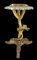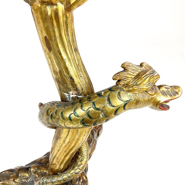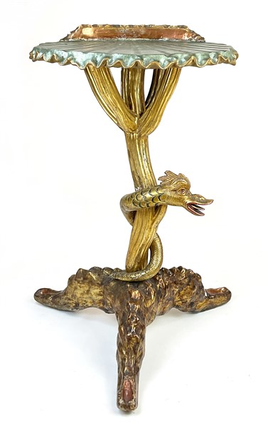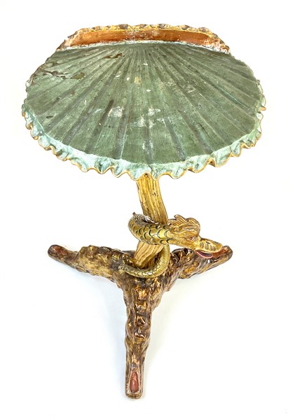 Gaetano Recchia, Verona, inizio secolo XX. Tavolino in legno intagliato, laccato e dorato, sostegno tripode a tronco con serpe, piano a valva di conchiglia. Etichetta cartacea su fondo del piano (cm 49x84x44) (difetti e mancanze)