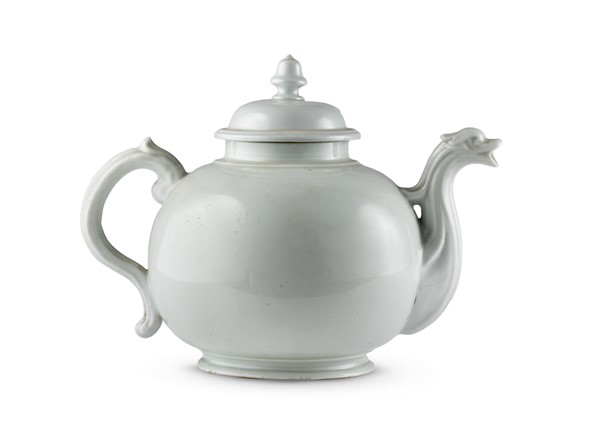 Manifattura di Ginori, Doccia, seconda metà del secolo XVIII. Teiera con coperchio in porcellana bianca di forma globulare con ansa a voluta e versatoio zoomorfo. Presa del coperchio a trottola (L. cm 21) (lievi difetti, coperchio adattato)