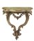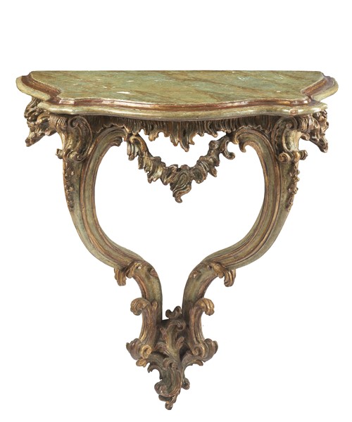 Console a goccia in legno intagliato e dorato, piano laccato a finto marmo, grembiale traforato a volute fiammate, gambe mosse terminanti a ricciolo. Secolo XVIII (cm 65x66,5x34) (difetti)