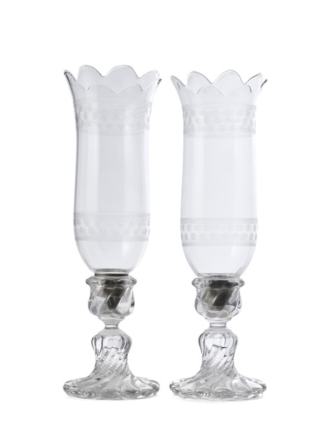 Manifattura di Baccarat. Coppia portacandele in cristallo con base baccellata e paralume in vetro inciso. Marchio a tampone sul fondo (h. cm 42) (lievi difetti)