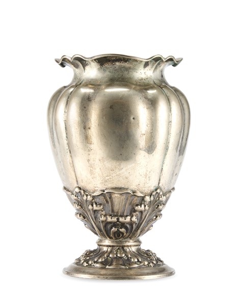 Vaso in argento con corpo scanalato su base circolare e fascia sbalzata a foglie. Milano, punzoni del Fascio, 1940 circa. Argentiere Gaetano Boggiali (h cm 30,5) (g 1000) (difetti)