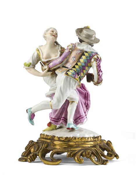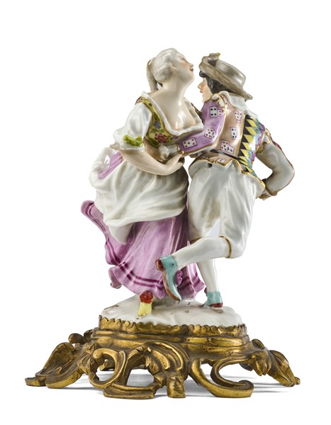 Da un modello di Meissen di Johann Friedrich Eberlein (1695-1749). Gruppo di danzatori tirolesi in porcellana dipinta in policromia con profili in oro, base rocaille in bronzo dorato (h cm 19) (difetti e piccoli restauri)