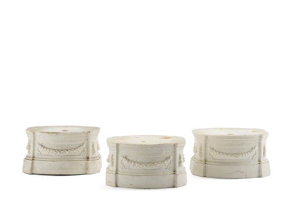 Manifattura di Vinovo, periodo Lomello, 1817. Tre basi sagomate in biscuit decorate a rilievo con festoni entro riserva. Marca e data incisi sotto la base (cm 11x6x9) (lievi difetti)