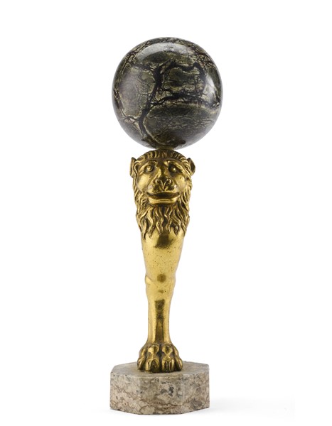 Oggetto di decorazione in bronzo dorato in forma di testa leonina terminante a zampa sormontato da sfera in marmo, base ottagonale in lumachella d'Egitto. Reca etichetta cartacea al retro (h. tot cm 15) (lievi difetti)
