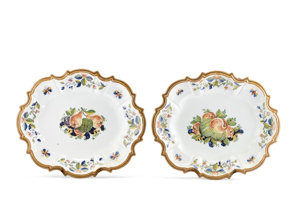 Manufacture of Pasquale Antonibon, Bassano, 18th century. Pair of majolica trays painted in polychrome "baroque fruit" (cm 33,5x28) (slight defects)