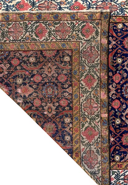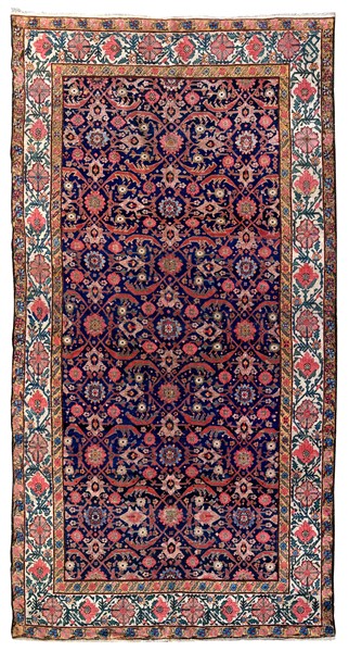 Tappeto passatoia Bachtiari, Persia, fine secolo XIX. Decoro Herati in policromia su fondo blu notte. Bordura principale a fondo bianco decorata con rami fioriti con andamento a meandro (cm 357x180) (difetti)