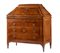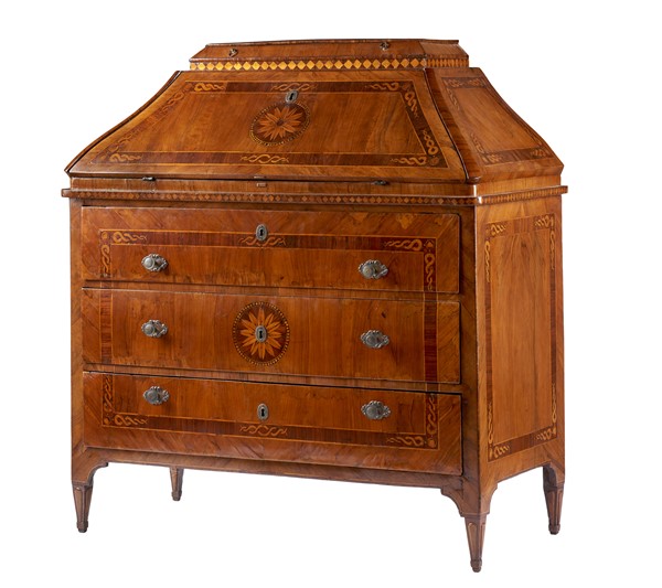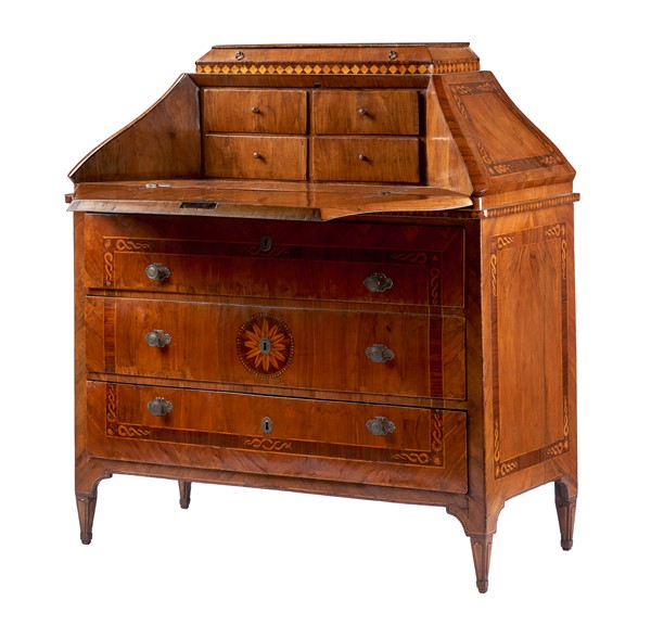 Ribalta a urna lastronata in noce, filettata ed intarsiata in palissandro e legni vari. Fronte a tre cassetti e calatoia celante quattro tiretti, cassettino nella parte superiore, piedi troncoconici. Fine secolo XVIII (cm 123x130x58) (difetti e restauri)