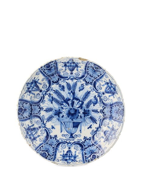 Manifattura di Delft, secolo XVIII. Piatto in maiolica a bordo mosso decorata nei toni del blu a vaso di fiori nel cavetto e a vasi di frutti entro riserve nella falda. Numerato alla base (d. cm 35) (difetti)