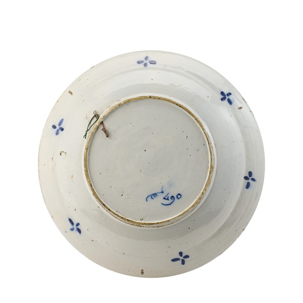 Delft Manufacture, 18th century. A blue and white majolica dish (d. cm 35) (defects)